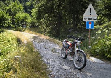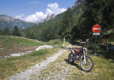 Bei dem Sträßchen handelt es sich um eine alte Trasse der Restefond-Strasse, die man wegen der vielen Kehren nicht ausgebaut hat. Der untere Abschnitt wird praktisch nicht mehr befahren und ist mit hohem Gras zugewachsen. Fahrzeuge der Schäferei parken den Einstieg zu und Weidezäune queren den Fahrweg. Nach wie vor schön und reizvoll zu fahren (mit Leichtenduro) aber mit größeren Fahrzeugen wird man nicht durchkommen. Es ist offensichtlich auch nicht mehr gewollt. Von oben her kommt man dagegen recht gut auf die Strecke, muss dann aber umkehren.